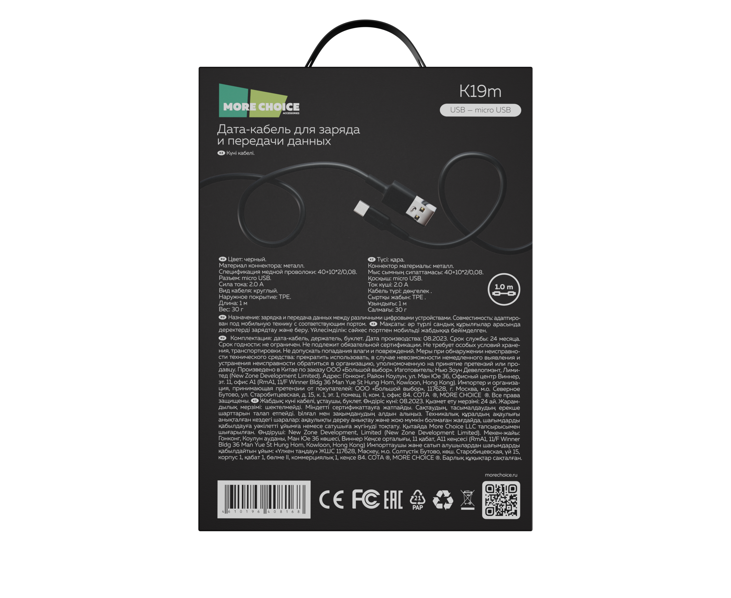 Материал коннектора: металл Наружное покрытие: TPE Спецификация медной проволоки: 40+10*2/0,08 Коннектор: USB - micro USB Сила тока: 2.0А. Длина: 1 м Комплектация: дата-кабель, держатель для кабеля, буклет. Цвета: Black, White