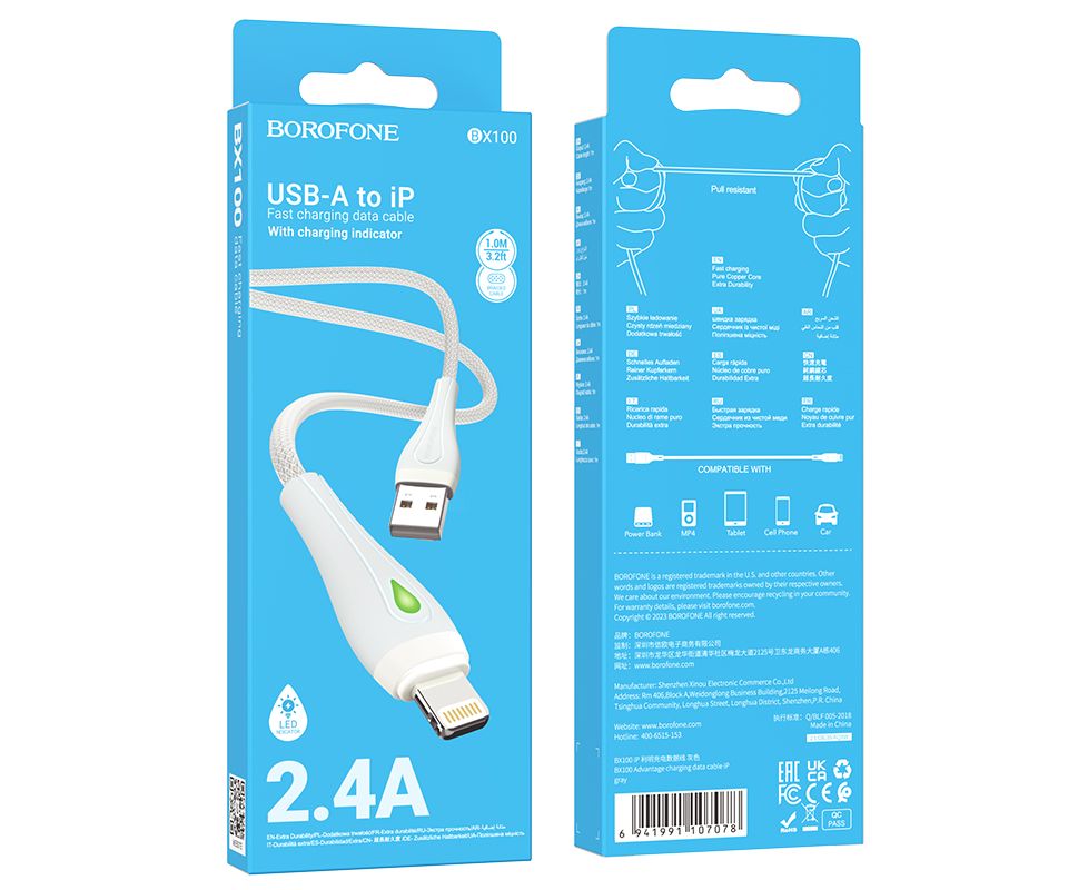 Borofone BX100 - это стильный, прочный и удобный в использовании кабель USB - Lightning 8-pin длиной 1 метр. Качественная оплетка TPE обеспечивает повышенную прочность и защиту от повреждений, что продлевает срок службы кабеля. Максимальная сила тока кабеля - 2.4А, что обеспечивает оптимальную зарядку устройств и позволяет использовать его для зарядки смартфонов, планшетов, наушников и других устройств с разъемом Lightning 8-pin. Этот кабель подходит для использования в домашних условиях, офисе или в автомобиле, идеально подойдет в качестве основного или запасного кабеля для зарядки. Вес 26 г. Выполнен в черном и белом цветах.