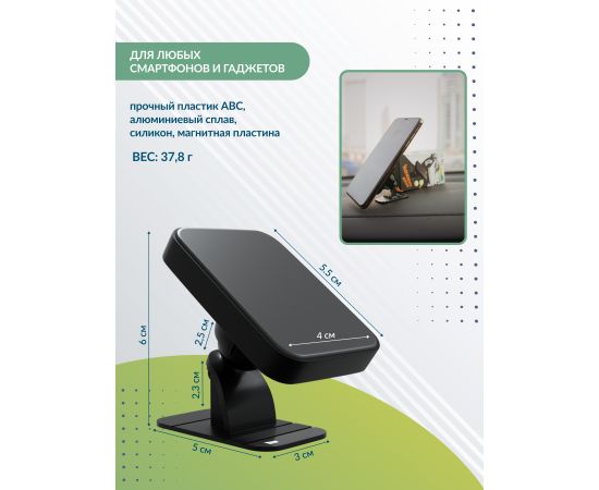 Материал: ABC-пластик, алюминиевый сплав, силикон, магнитная пластина Вид держателя: магнитный Место крепления: приборная панель автомобиля Совместимость устройства: универсальный Комплектация: магнитный держатель, табличка для номера телефона, буклет Цвета: Black
