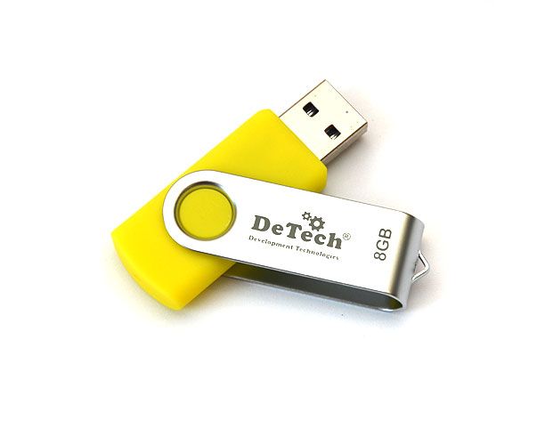 Корпус DeTech изготовлен из прочного пластика. Благодаря богатой цветовой гамме каждая модель приобретает индивидуальный характер. Дополнительным преимуществом является поворотная металлическая скоба, которая также защищает устройство памяти USB и придает ему неповторимый вид. Поворотная система замыкания USB и отсутствие колпачка удовлетворит потребности даже самых рассеянных пользователей.