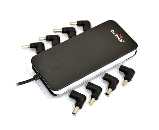 DeTech TJ-051 LCD Автоматический ультратонкий универсальный блок питания для ноутбуков с питанием 12-24 В — до 5 А, мощность 90 Вт. с USB выходом 5В 1А для зарядки различных устройств (МР3 плееров, моб. телефонов и др.). и LCD индикатором выходного напряжения.