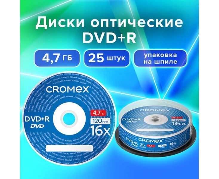 Диск DVD+R CROMEX 513777, 4,7Gb, 16x, Cake Box (упаковка на шпиле) 25шт