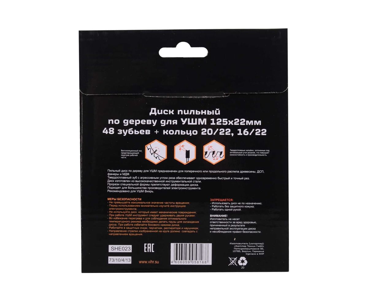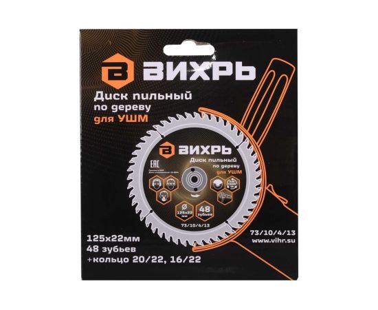 Диск пильный Вихрь 73/10/4/13 по дереву для УШМ 125х22мм, 48 зубьев+кольцо 20/22, 16/22