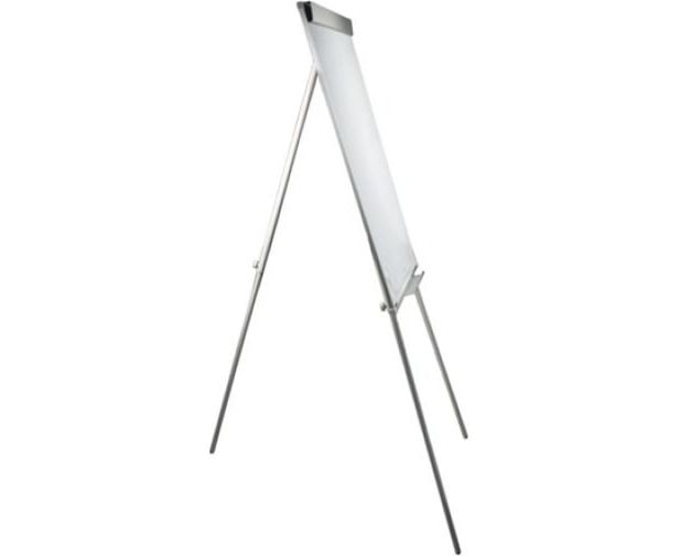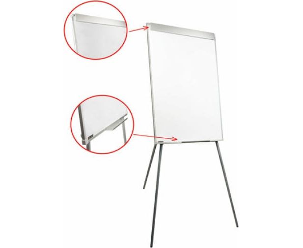 Белое лаковое покрытие предназначено для письма специальными маркерами для белой доски. Размер доски – 100х70 см. Регулируется по высоте до 164 см. Устанавливается на треноге. Металлическая поверхность позволяет размещать объявления при помощи магнитов. Блокнот крепится при помощи неподвижных винтов.