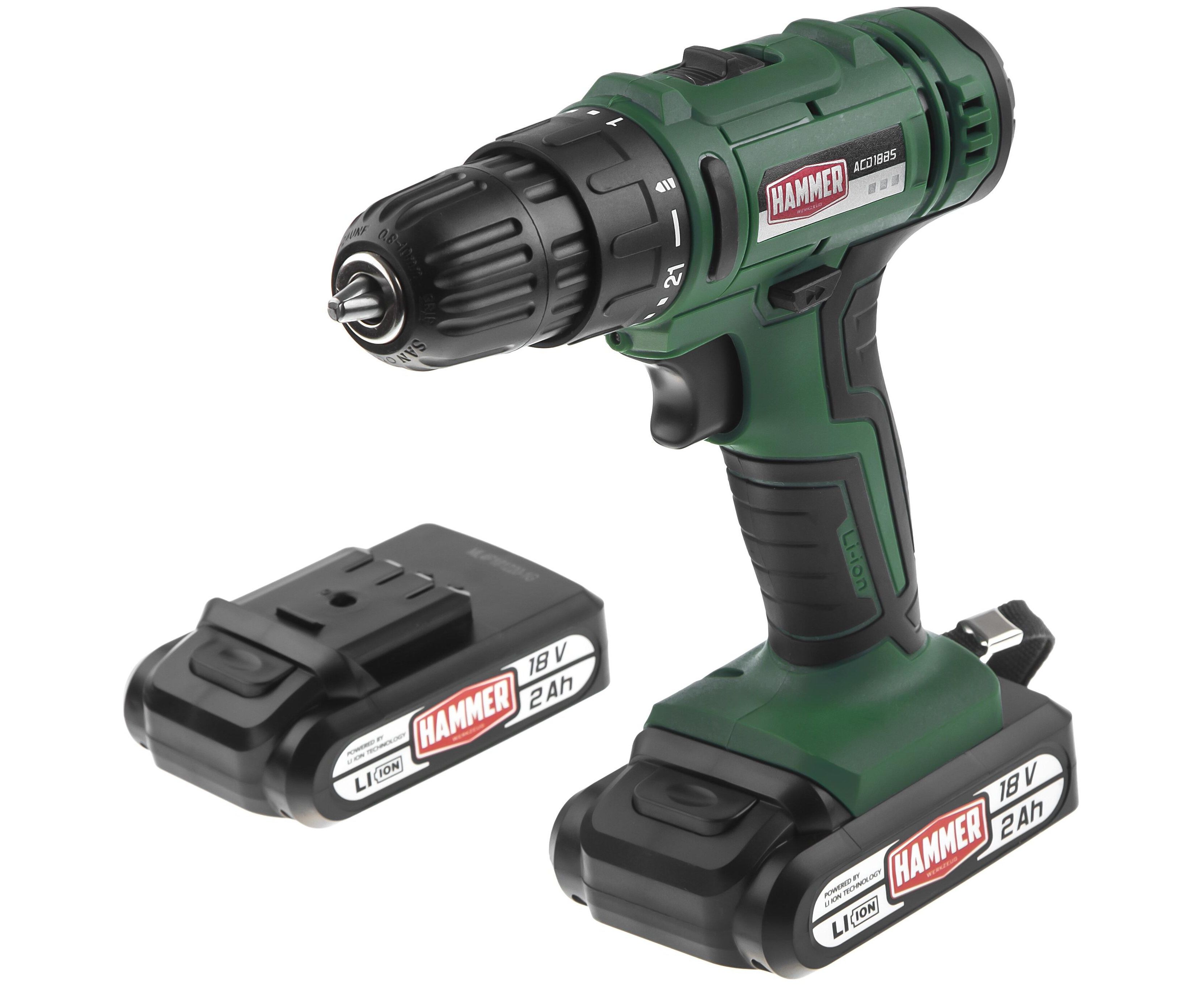 Подробная комплектация дрель-шуруповёрт, аккумуляторы - 2 шт., зарядное устройство, кейс