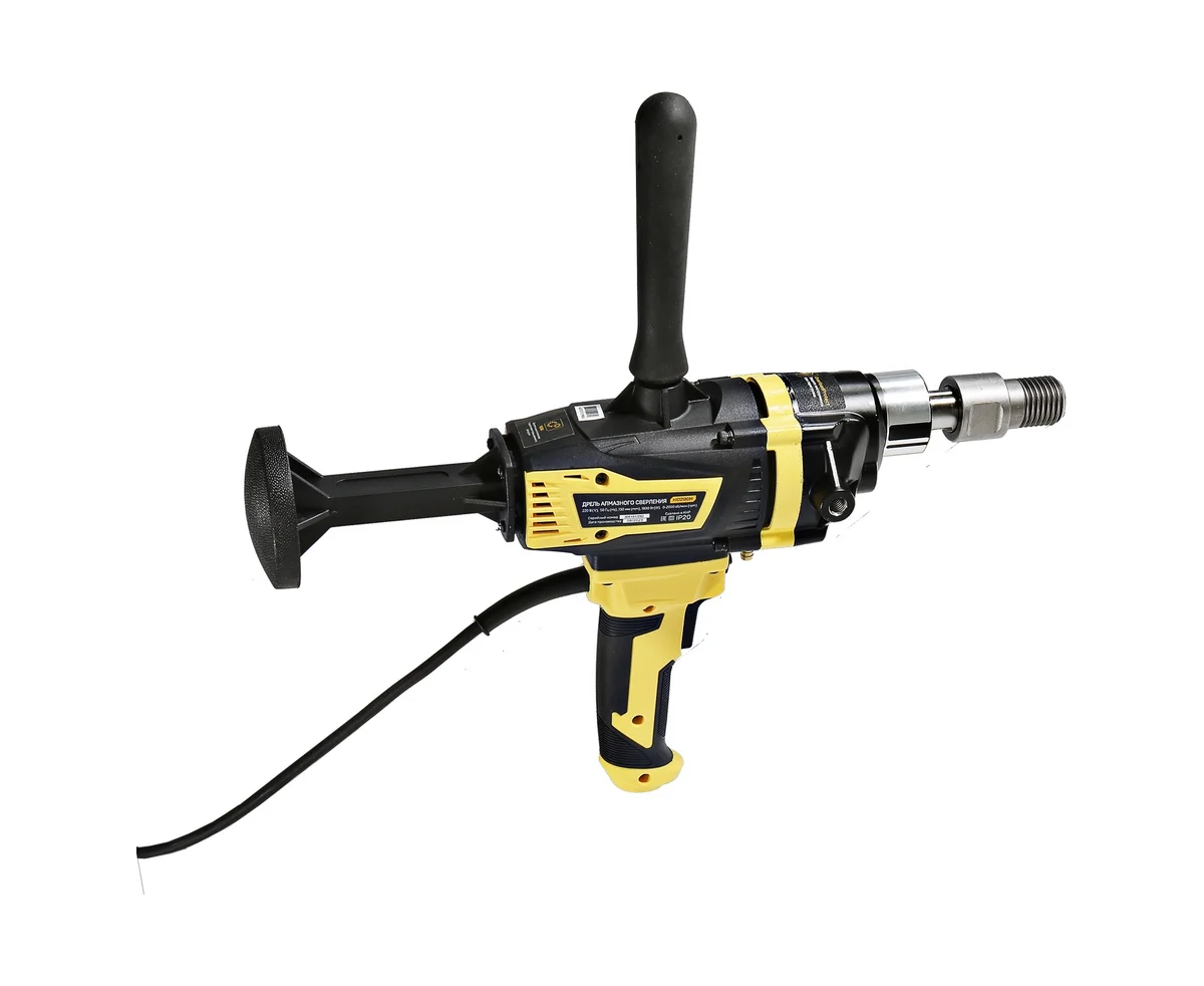 Применение в конструкции фирменных японских подшипников NSK повышенного ресурса способствует исправной и долговечной эксплуатации электроинструмента. Удобству в практическом обращении с дрелью содействует адаптер под алмазные коронки с хвостовиком 1 1/4", идущий в комплекте, фиксатор-липучка расположенный на кабеле и блокировка выключателя во включенном положении при длительных работах. Регулировка частоты вращения осуществляется усилием, приложенным к кнопке включения.