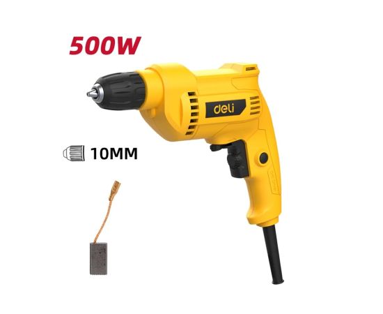 Deli DL-DZ10-E2 — мощная и удобная сетевая дрель для любых задач!Двигатель 500 Вт и скорость до 3300 об/мин позволяют легко сверлить дерево, металл и пластик, а продуманная конструкция делает работу комфортной даже при интенсивном использовании.