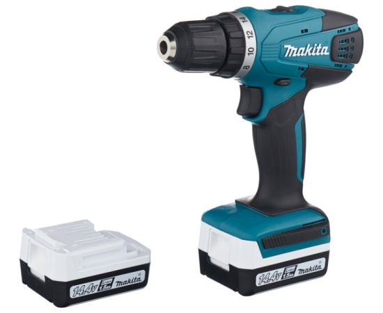Дрель-шуруповерт Makita DF347DWE Дрель ак,(14.4В,2х1.5Ач Li-ion,БЗП-10мм,0-400/0-1400об/м,30/15Нм,1.4кг,чем,G-серия)