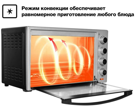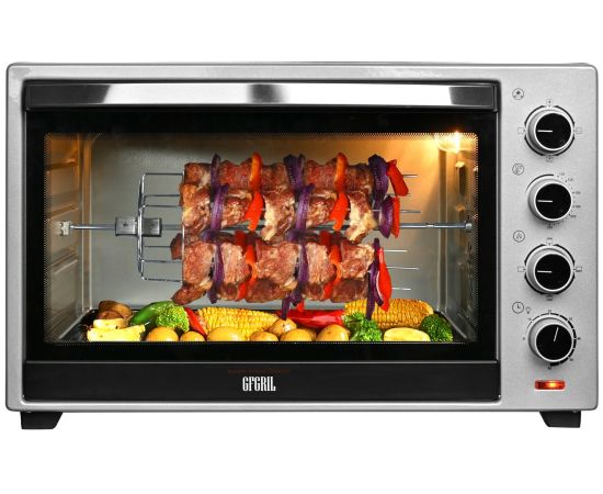 Мини-печь Gfgril GFO-60 мощностью 2000 Вт легко заменит духовку. В комплекте идут ухват, вертел, подставка для пиццы, решетка, плоский противень. Есть режимы конвекции и гриля.