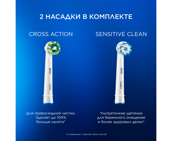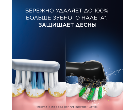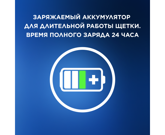 Электрическая зубная щетка с 2 сменными насадками. 3 режима чистки — ежедневная, бережная, экстра бережная. Встроенный таймер помогает чистить зубы в течение рекомендованного времени и сигнализирует каждые 30 секунд о необходимости сменить зону чистки. Цвет щетинок показывает необходимость смены насадки. Технология возвратно-вращательных движений способствует тщательному очищению поверхности зубов и удалению налета.