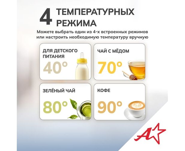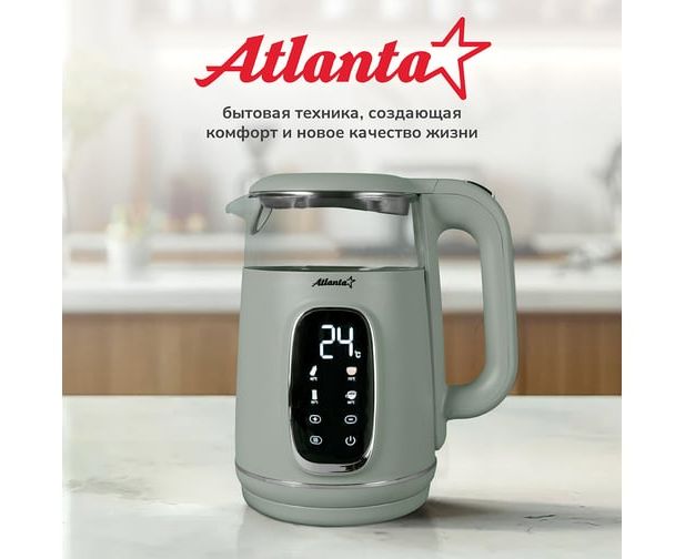 Электрический чайник Atlanta — это стильный и функциональный прибор, который станет незаменимым помощником на вашей кухне. Двойные стенки чайника обеспечивают эффективное сохранение тепла, а вращение на подставке на 360° гарантирует удобство использования. Вы можете выбрать одну из четырех температурных настроек, чтобы приготовить идеальный напиток для любого случая. Корпус из нержавеющей стали и пластика придает чайнику прочность и элегантный внешний вид. Удобное управление делает процесс использования простым и интуитивно понятным.