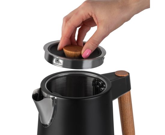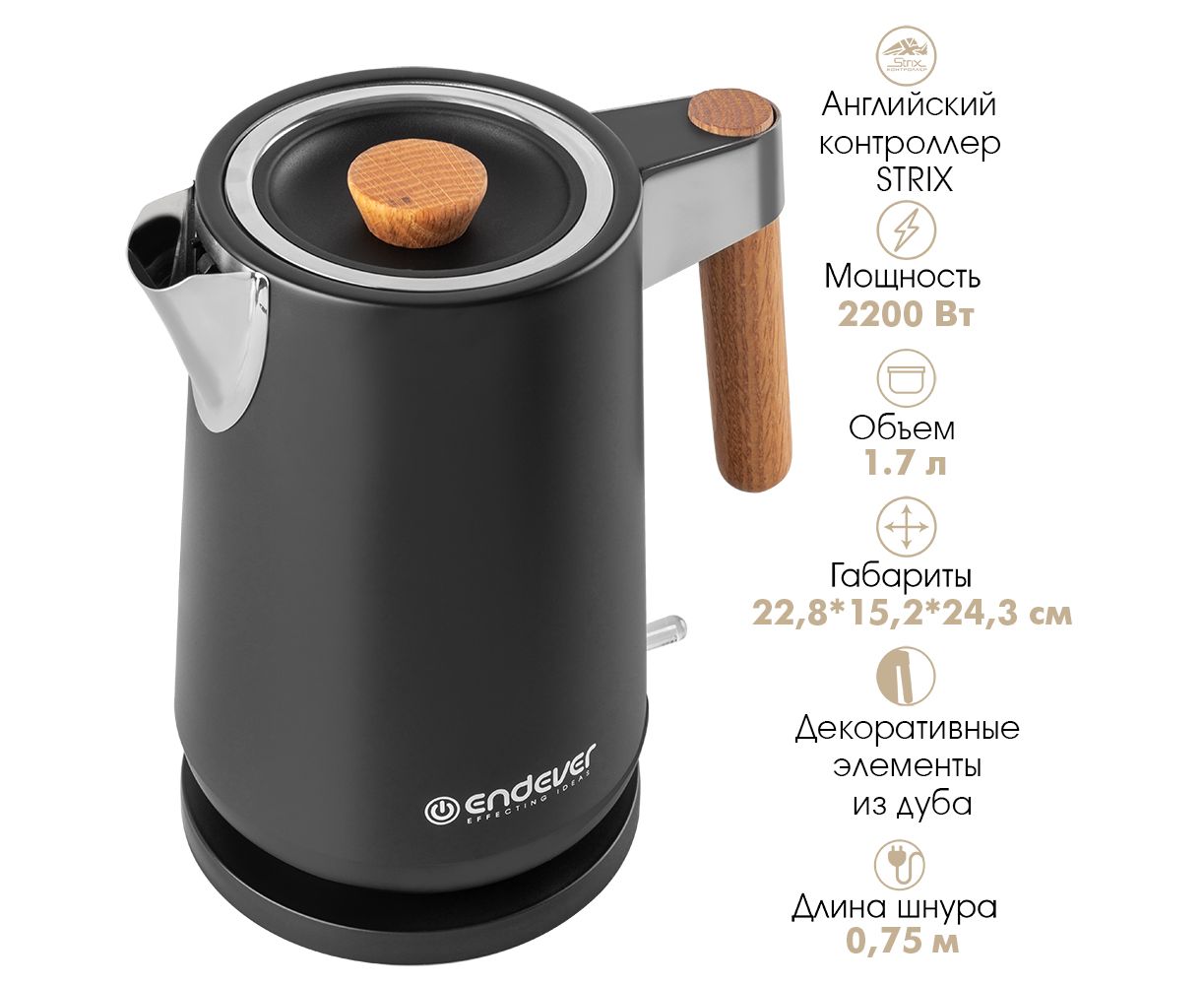 Беспроводное соединение позволяет вращать чайник на подставке на 360 градусов, Корпус из нержавеющей стали, Ручка из натурального дуба, Английский контроллер STRIX, Автоотключение при закипании воды, Шкала уровня воды, Защита от перегрева, Скрытый нагревательный элемент, Съемный фильтр-сетка для защиты от накипи, Отсек для хранения шнура