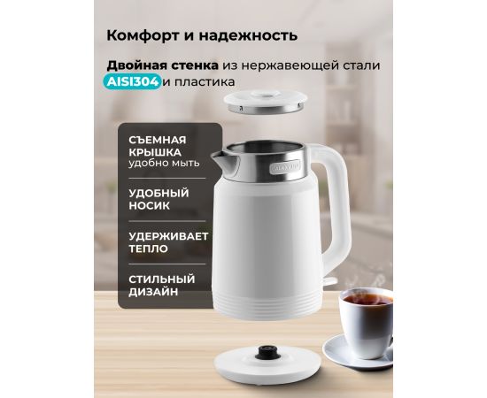Чайник имеет двойные стенки из нержавеющей стали AISI 304 и пищевого пластика. Теплоизолирующий зазор (воздушная подушка) создает эффект термоса,