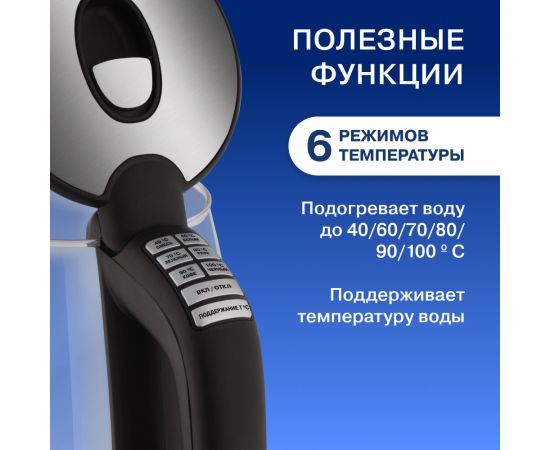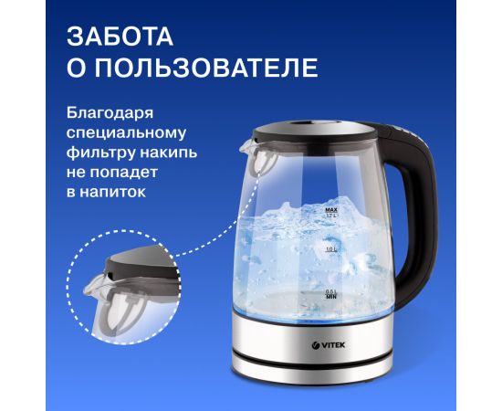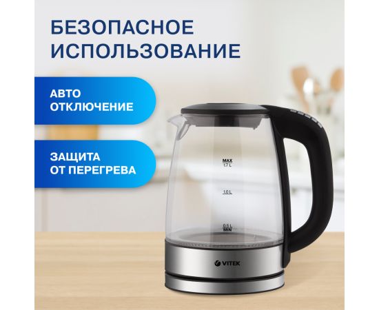 Чайник VITEK VT-8828 объемом 1,7 л с корпусом из высококачественного термостойкого стекла станет незаменимым помощником для всей семьи. Даже сам процесс нагревания воды вызывает настоящее эстетическое удовольствие, так как внутренняя подсветка корпуса меняет свой цвет в зависимости от ее температуры! Прибор имеет 6 режимов (40°С/60°С/70°С/80°С/90°С/100°С), которые позволят не только правильно заварить черный, зеленый, белый, цветочный чай или растворимый кофе, но и приготовить детскую молочную смесь. Выбрать определенный вариант очень легко: достаточно нажать на необходимую кнопку.