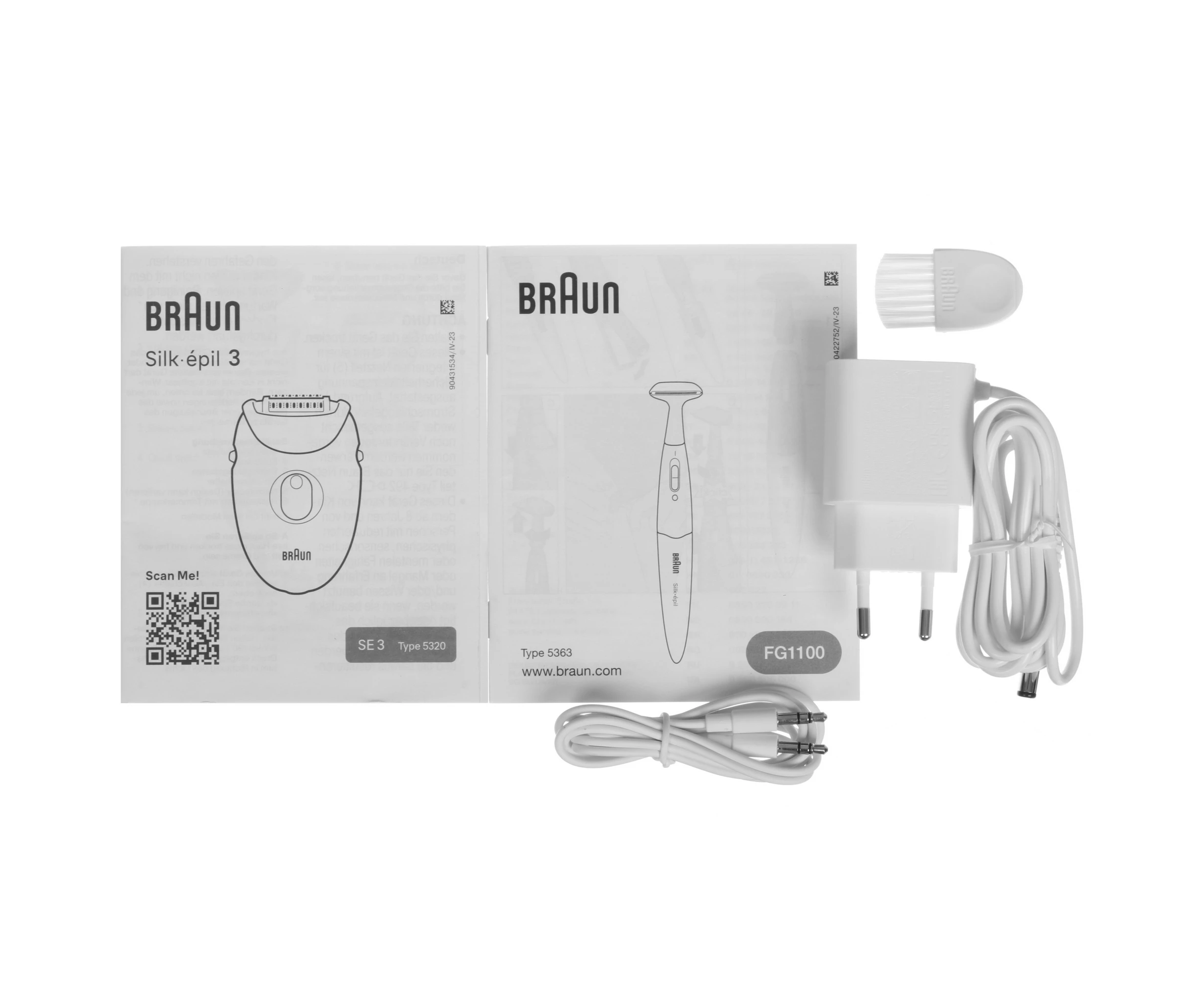 документация, зарядное устройство, триммер Braun FG1100, щетка для чистки, эпиляционная головка