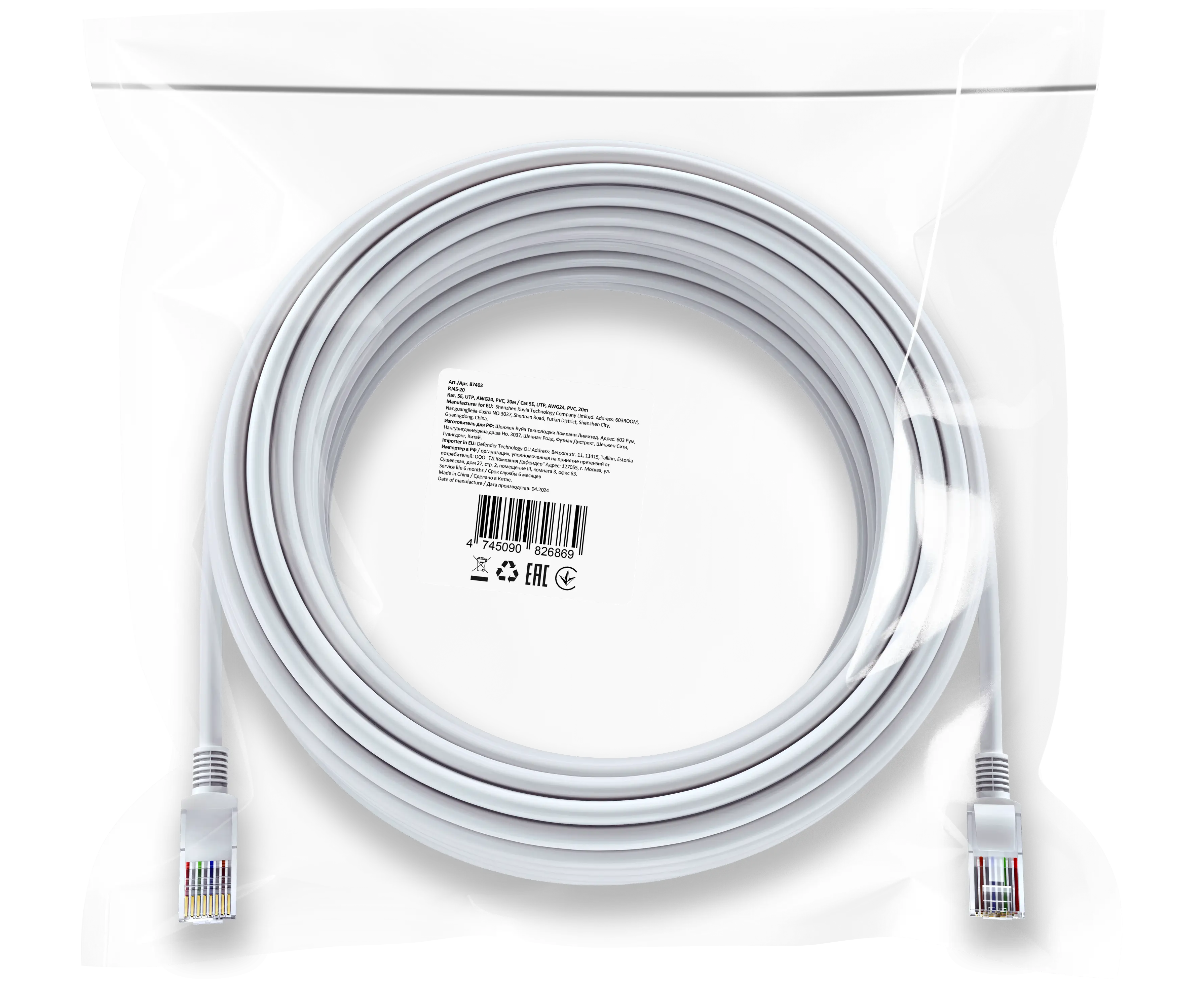 Ethernet кабель DEFENDER RJ45-20 Cat 5E, UTP, AWG24, PVC, 20м 87403