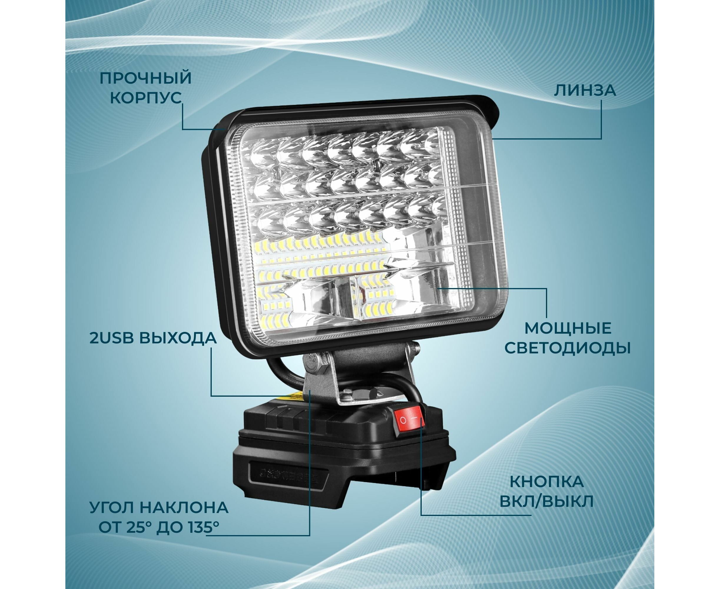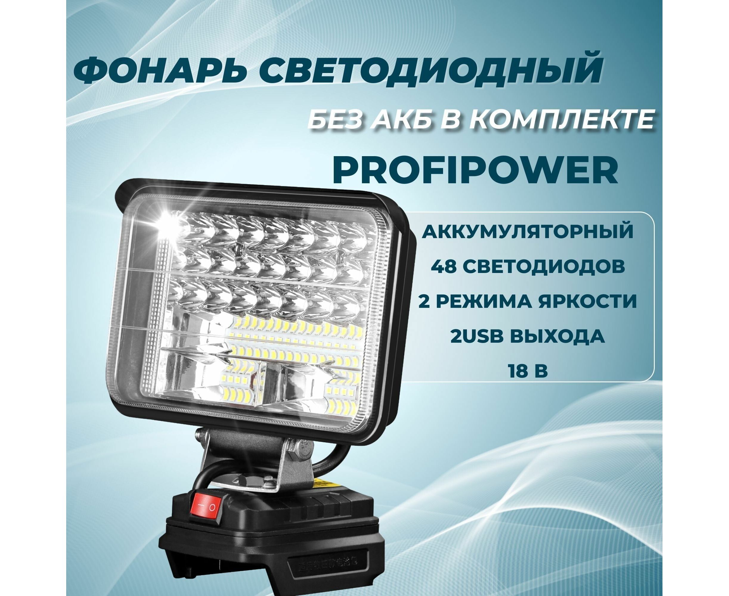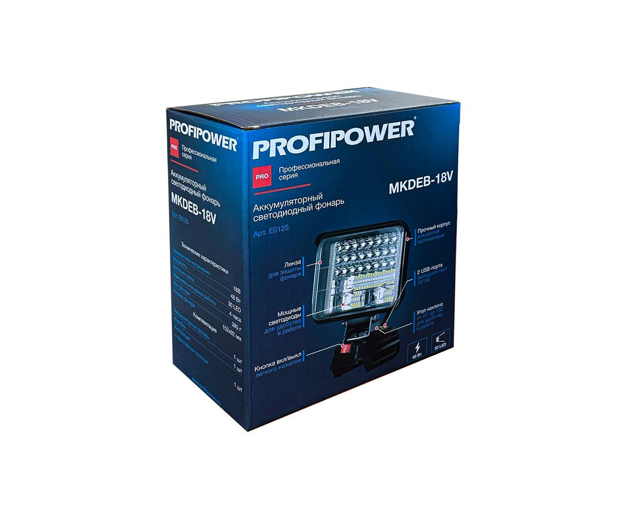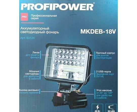 Фонарик MKDEB-18V 48Вт – электроинструмент, который необходим для освещения рабочей зоны внутри помещения или на улице. Также может использоваться в качестве аварийного освещения для подготовки к чрезвычайным ситуациям. Идеально подойдет для мастеров, которые работают в темное время суток на объекте, возле дома, или для мужчин, которые занимаются хозяйственными работами на даче или в саду. Уличный фонарь имеет небольшой вес и удобно лежит в руке. Многогранный рефлектор контролирует направление и яркость света для того чтобы обеспечить четкое круглое пятно света с равномерной высокой яркостью. Голова поворотного механизма (от -25° до +130°) позволяют максимально точно направить свет и значительно повышают удобство эксплуатации. Имеет прочный корпус и 2 USB-порта (5В/1А) для питания внешних устройств. Работает от аккумуляторов с напряжением 18 В. Максимальное время работы составляет 4 часа. Дальность освещения - 15 м. Устройство совместимо с аккумуляторами MAKITA, PROFIPOWER. Переносной диодный фонарь будет отличным подарком любимому мужу или папе на день рождения. Подумайте о приятном презенте для парня, если он любит работать и проводить время на дачном участке. Тот, кто занимается строительством или ремонтом обязательно оценят такой аккумуляторный инструмент. Фонарь светодиодный аккумуляторный ProfiPower MKDEB-18V (без аккумулятора, подходит артикул X0005, X0004 и для литиевой батареи Makita18v