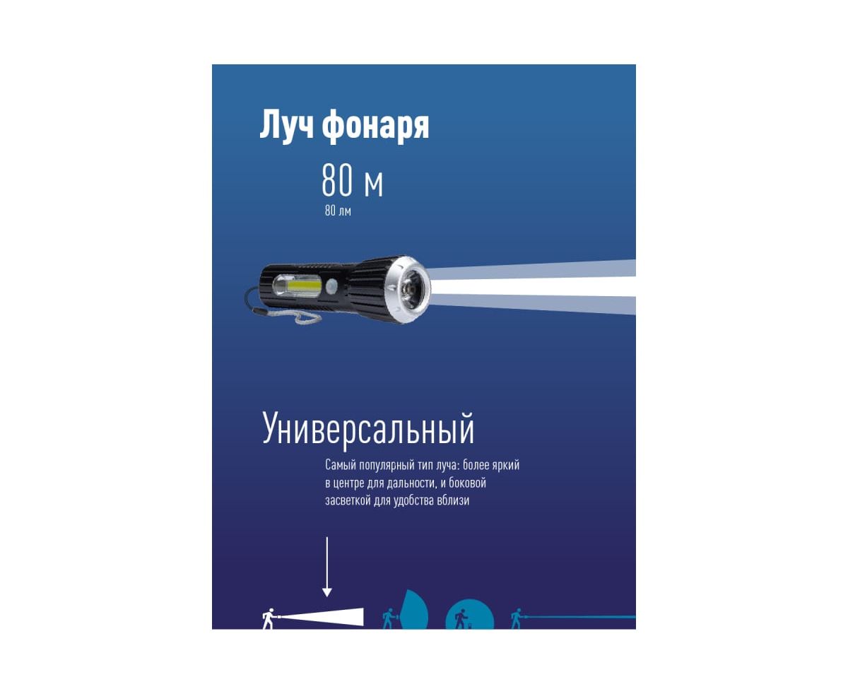 -Дистанция освещения: 80 м. (луч)/12м2 (широкий свет, боковой светильник).