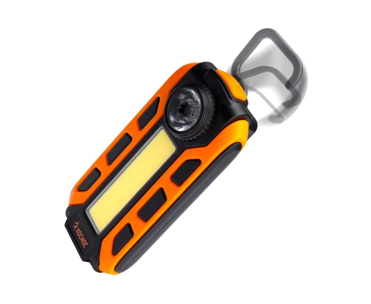 Фонарь светильник КОСМОС рабочая серия 5Вт COB+1ВтLED/кол линза/3xAAА/ABSпластик/магнит/крюк/зажим, KOS703B совмещает широкий свет (освещает пространство с одной стороны) и луч фонаря (направленный свет). Источник питания: 3xAAА (в комплект не входят). Количество режимов: 2 (яркий широкий свет - яркий луч).