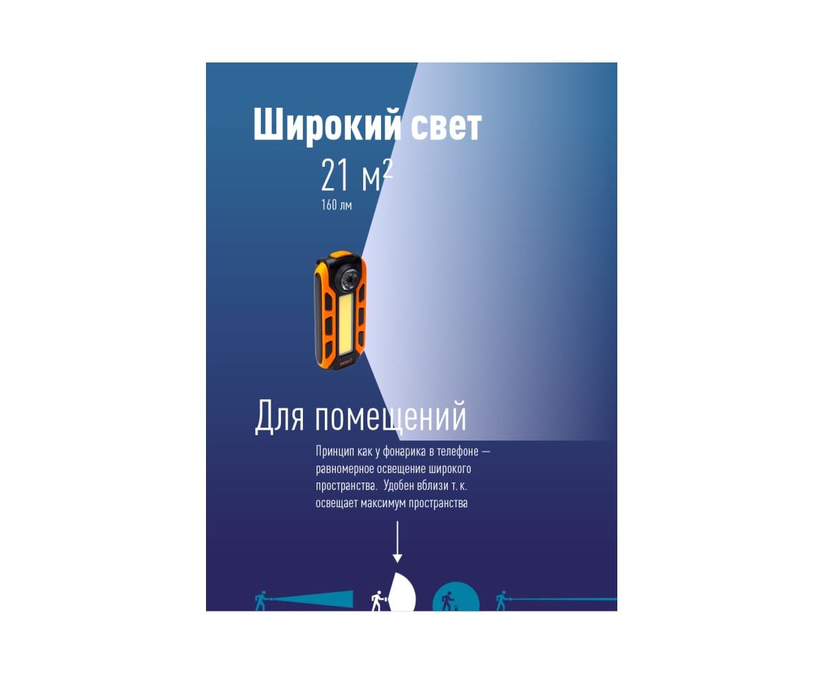Источник света: 5 Вт COB LED (широкий свет); 1 Вт LED (луч), с коллиматорной линзой - позволяет создать поток света нужной направленности без снижения интенсивности. Световой поток: 160 лм. (широкий свет)/70 лм. (луч); Дистанция освещения: 21 м2 (широкий свет)/30 м (луч).