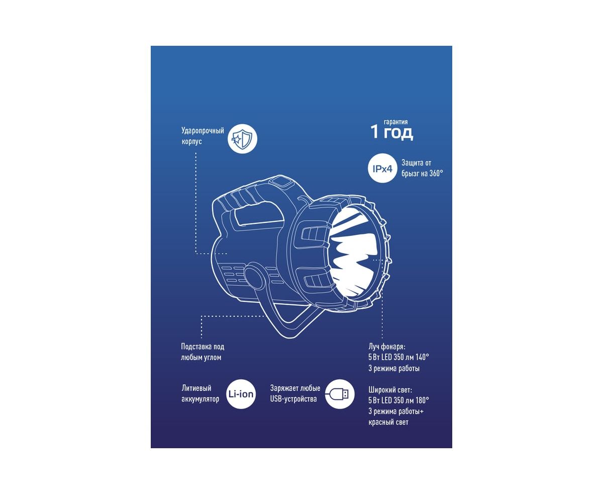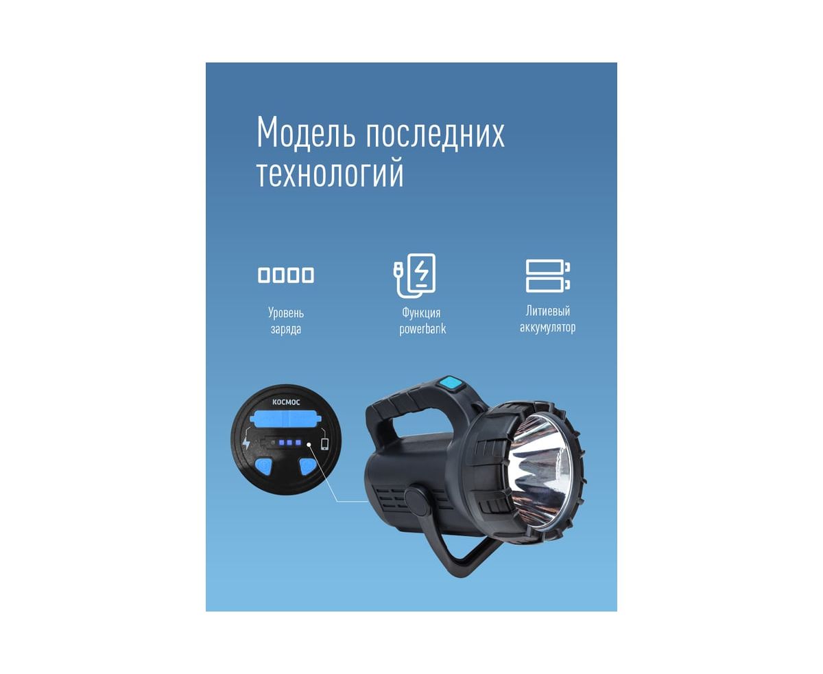 Фонарь КОСМОС Premium 5Вт направленный свет, 5Вт СОВ, литий 3600mAh, MICRO USB шнур в комплекте KOSAc8010WLith имеет умный индикатор зарядки покажет, сколько именно энергии осталось. Удобный переключатель: несмотря на 7 режимов света, фонарь легко включить и выключить длительным нажатием. Функция powerbank: подзарядка мобильных устройств. Подставка с регулируемым углом. Заряд фонаря от USB позволит использовать подзарядку даже в автомобиле или на природе от powerbank.