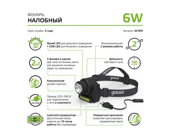 Фонарь налобный Gauss GFL309 черный 6Вт лам.:светодиод. (GF309)