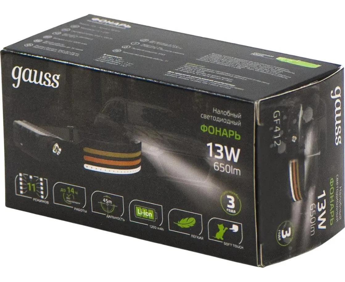 Фонарь налобный Gauss GFL412 черный 13Вт лам.:светодиод. встроенный аккумулятор (GF412)