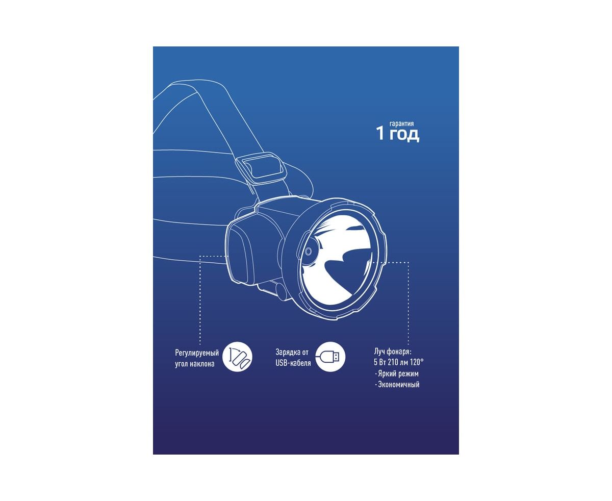 Фонарь налобный светодиодный аккумуляторный КОСМОС KOCAccuH5WLED H5W, 2 режима, 5W LED, 2ah, зарядка от USB