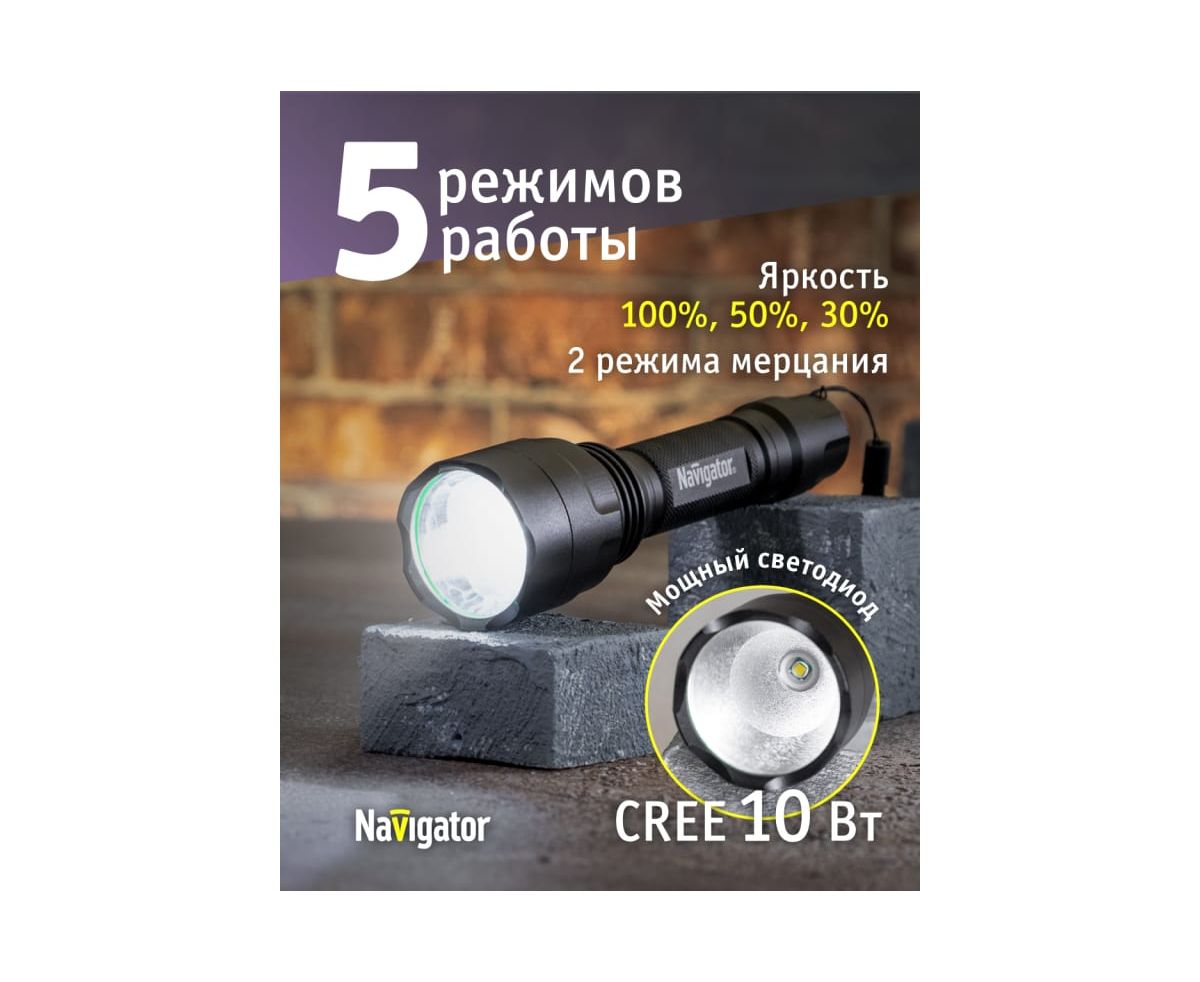 Преимущества Navigator NPT-P03-18650 алюминий, 1 CREE LEDx10Вт, аккумулятор 3.7В, 2А 71583