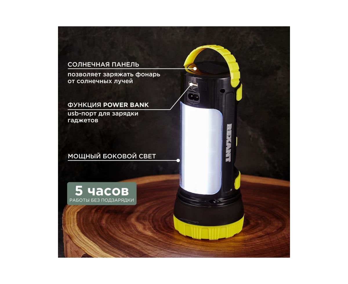 Преимущества REXANT с боковым светом, powerbank, солнечная батарея 75-7822