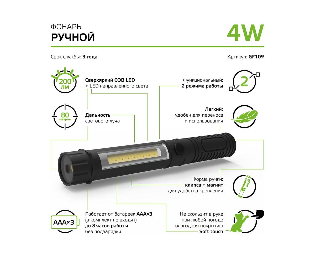 Технические характеристики Gauss GFL109 4W 200lm 3xAAA LED GF109