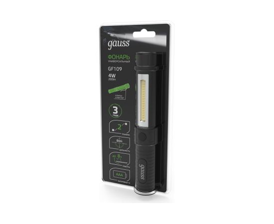 Ручной фонарь GAUSS модель GFL109 4W 200lm 3xAAA LED отличается компактностью и сверх-лёгкостью, поэтому их удобно брать с собой на прогулки, в поездки. Работает такой источник света от батареек AAA. Установлен яркий современный светодиод, снабженный качественным светоотражателем. Время работы без подзарядки до 8 часов.