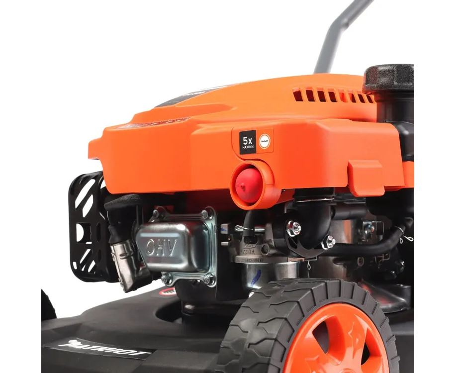 Газонокосилка с ножом; Комплект колес; Рукоятка верхняя; Рукоятка нижняя; Травосборник; Клипса крепления троса; Комплект болтов и саморезов; Свечной ключ, Отвёртка; Инструкция по эксплуатации