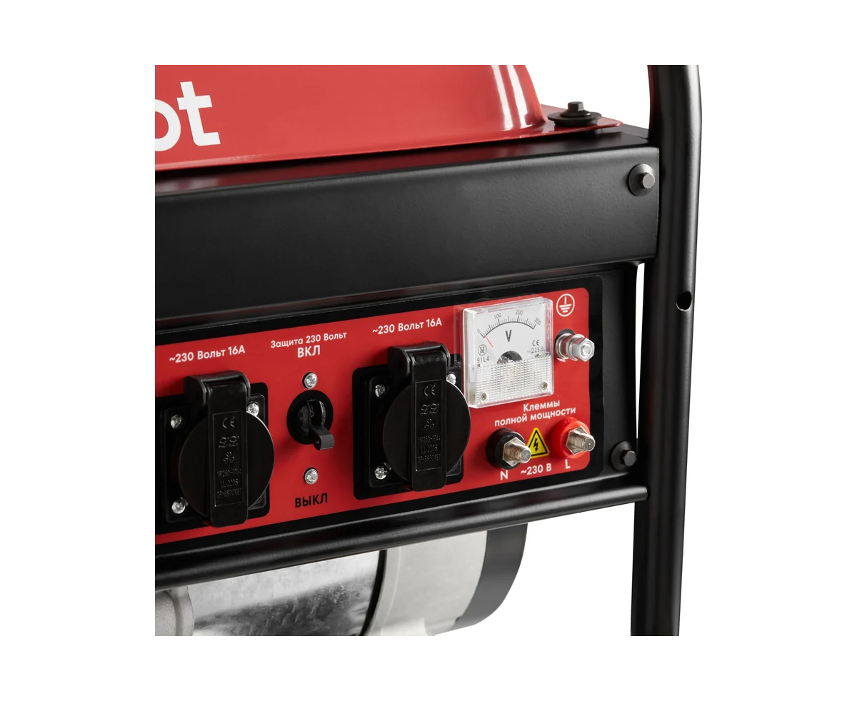 Две розетки 16А облегчают использование с несколькими потребителями. Клеммы полной мощности 230 В позволяют задействовать всю мощность генератора в любых условиях, даже без использования штепсельной вилки: достаточно оголить концы проводов, накрутить их на клеммы и зажать защитными колпачками.
