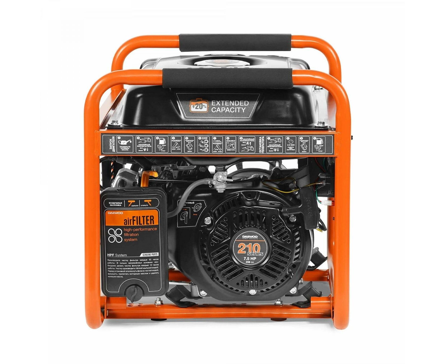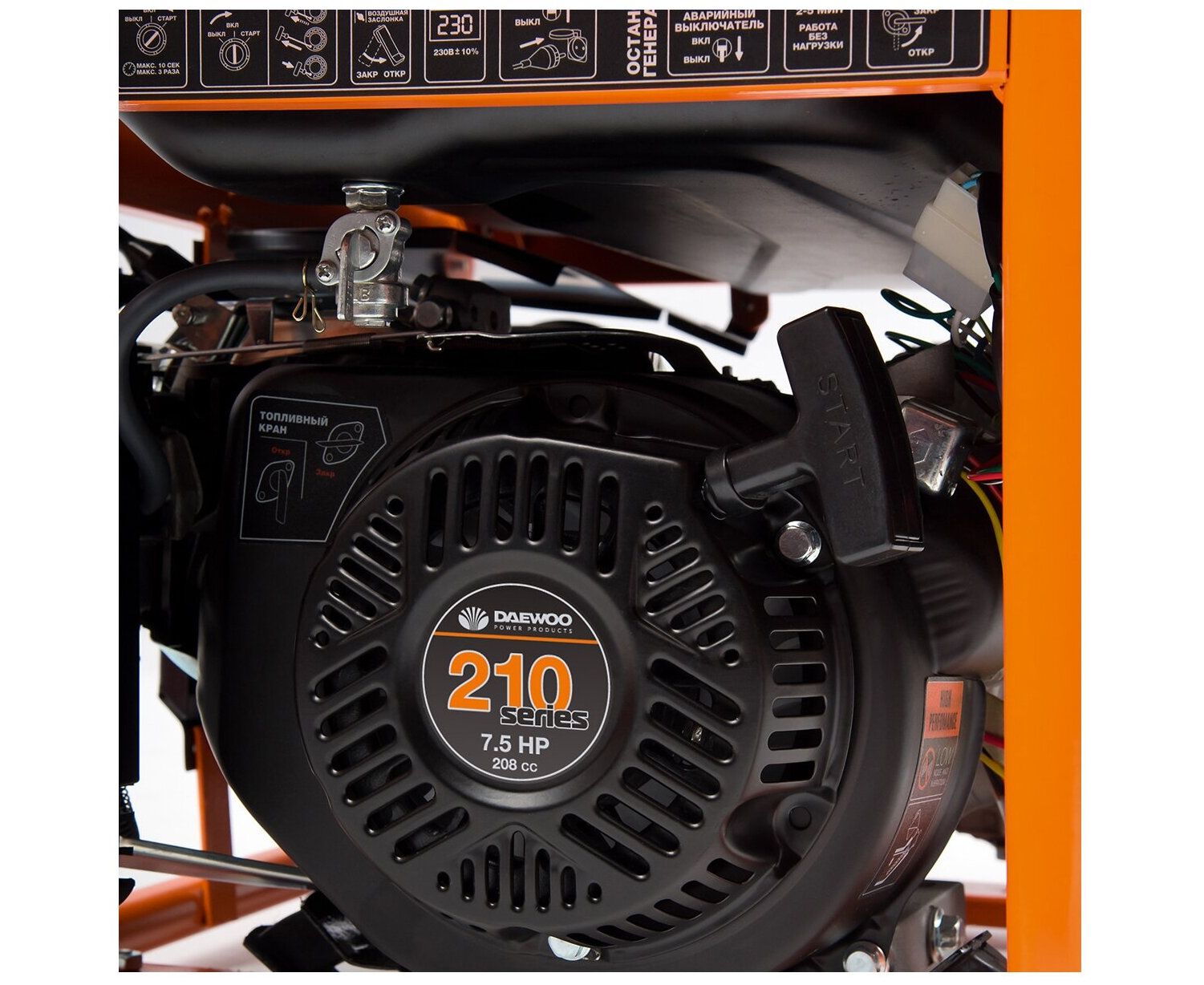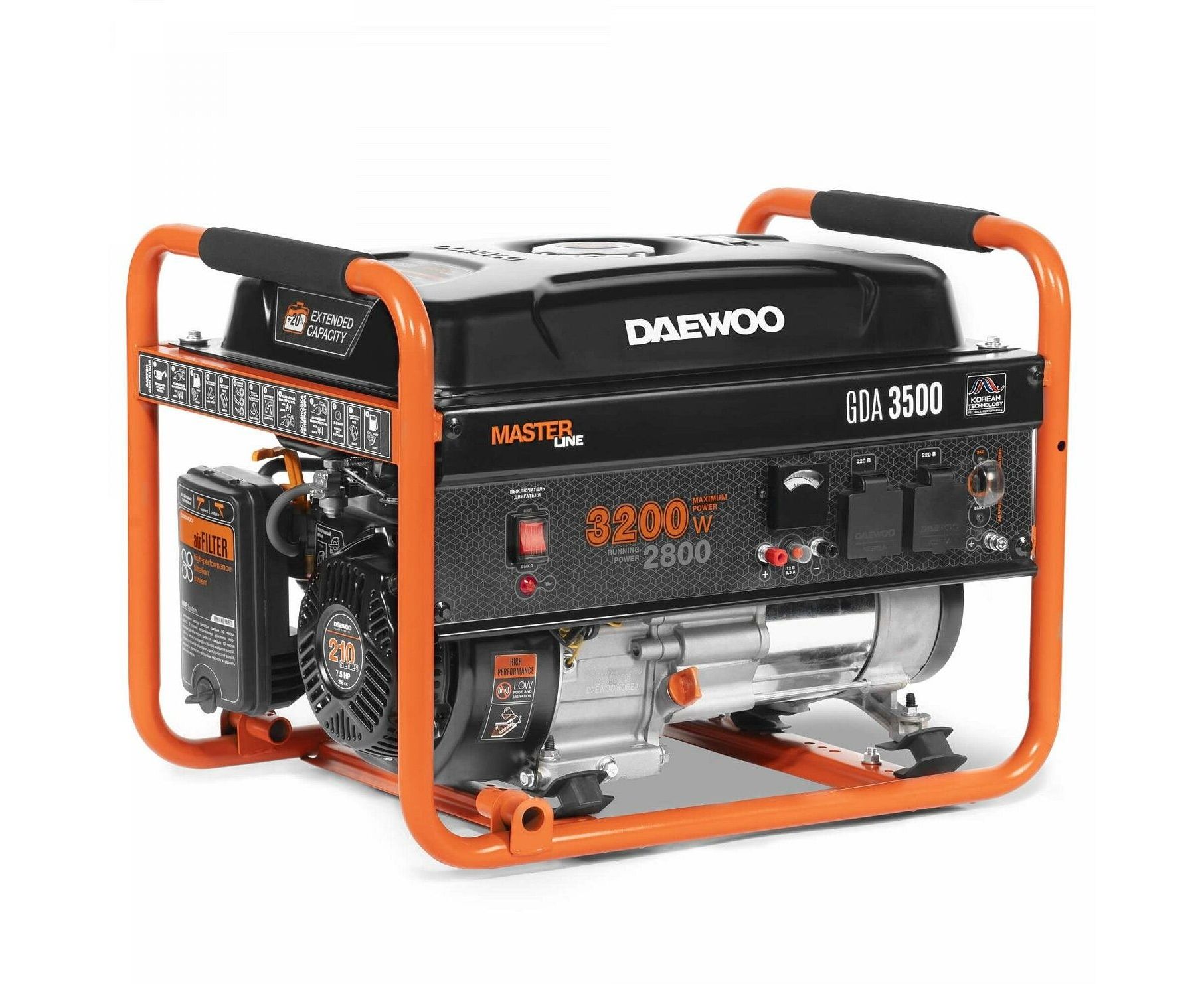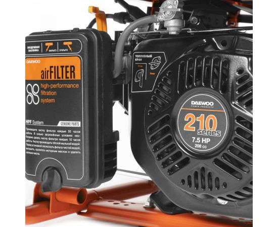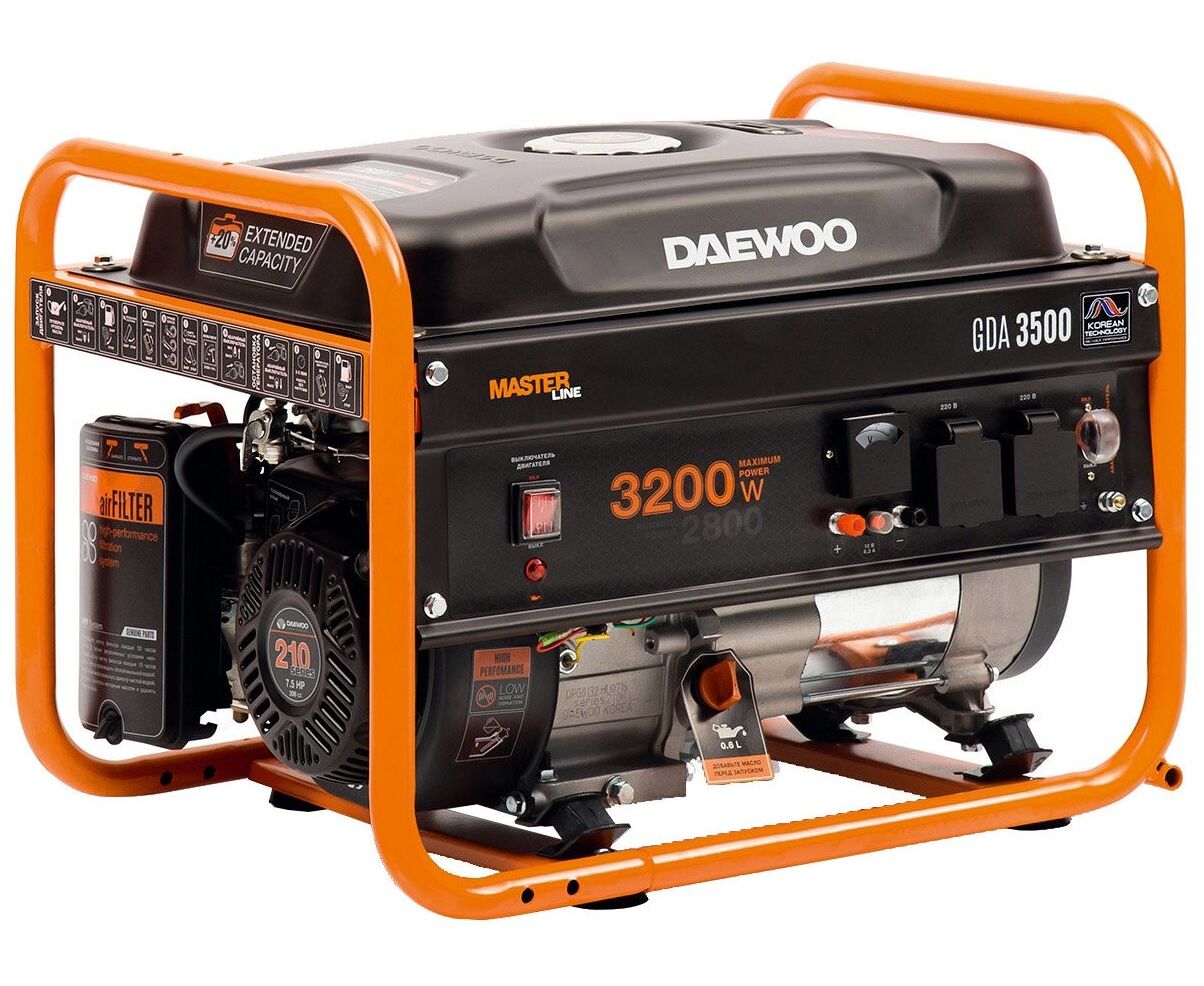 Электрогенератор Daewoo GDA 3500 обладает оптимизированной конструкцией, что позволило производителю увеличить мощность четырехтактного двигателя до 7.5 Вт. Это положительным образом сказывается и на работе аппарата, его экономичности даже при максимальных нагрузках. Для работы агрегата используется бензин. Мощность генератора при подключении к сети 220 В соответствует 2.8 кВт.