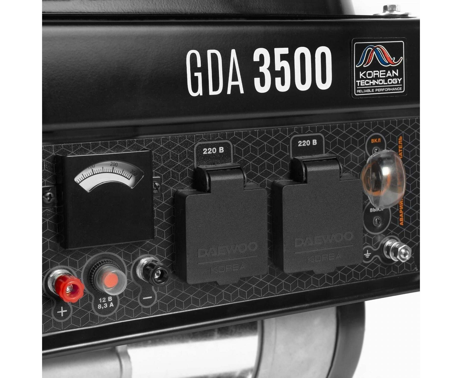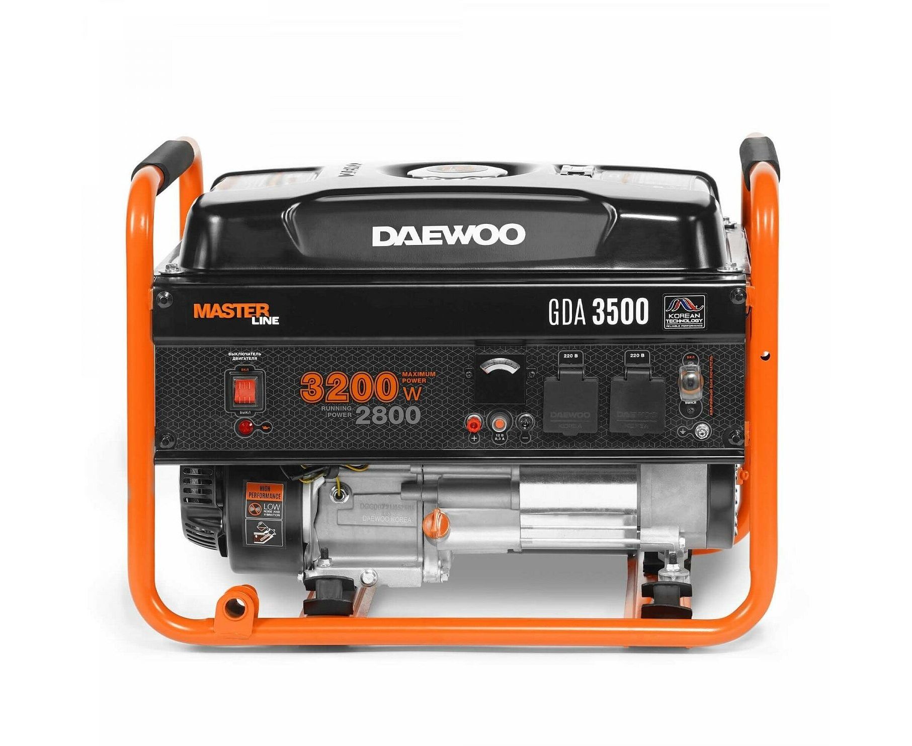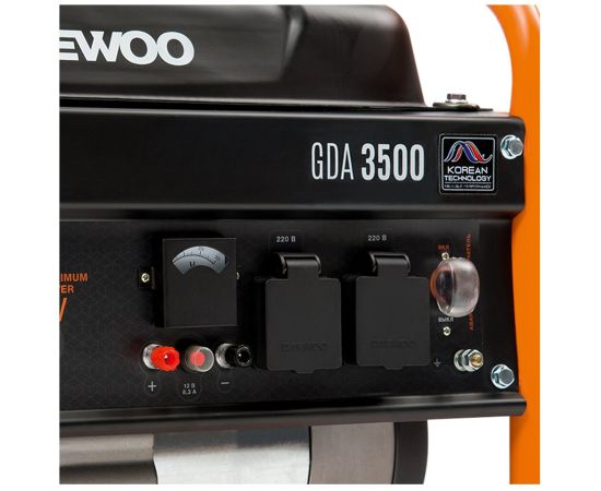 Daewoo GDA 3500 задействует в работе стабилизацию напряжения AVR. Корпус прибора содержит две розетки 220В/16А. Оборудование с емкостью топливного бака 18 л предусматривает ручной запуск. Во включенном состоянии уровень шума электрогенератора соответствует 69 дБ.Он весит 37 кг и содержит выступающие элементы, обеспечивающие комфортную транспортировку аппарата.