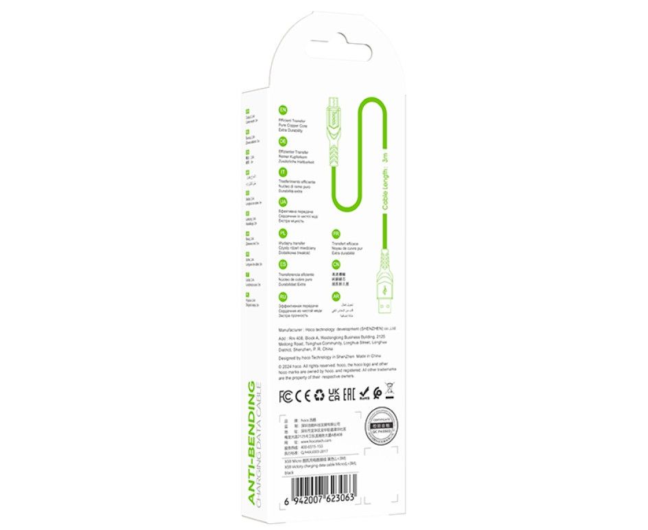 Кабель HOCO X59/ USB Micro/ 3m/ 2.4A/ Нейлон/ Черный, (Арт. HC-23063)