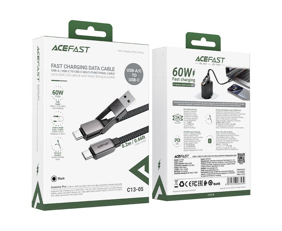 Дата-кабель ACEFAST AF-C13-05-BK USB-A/USB-C To USB-C Short Zinc Alloy Connectors Charging Data Cable 0,2m Black