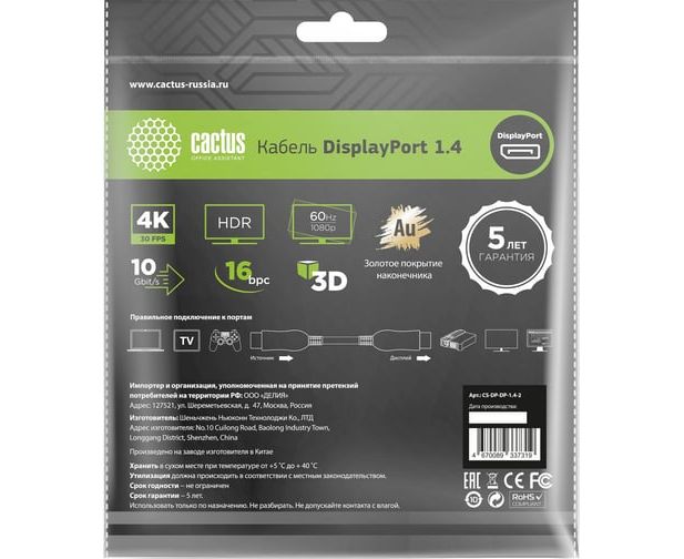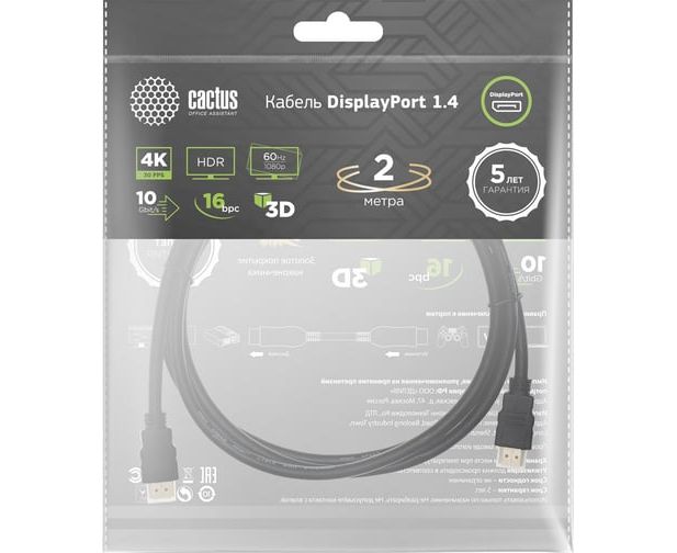 Кабель аудио-видео Cactus CS-DP-DP-1.4-2, DisplayPort(m)-DisplayPort(m) ver 1.4, 2м, Gold, черный