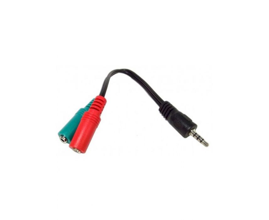 Кабель переходник 3.5 мм штекер 4 pin на 2 гнезда 3.5 мм (микрофон + наушники) для подключения наушников с микрофоном к мобильному телефону. Материал оболочки: ПВХ снаружи, цвет: черный, длина 0.15м, упаковка: ПЭТ пакет.