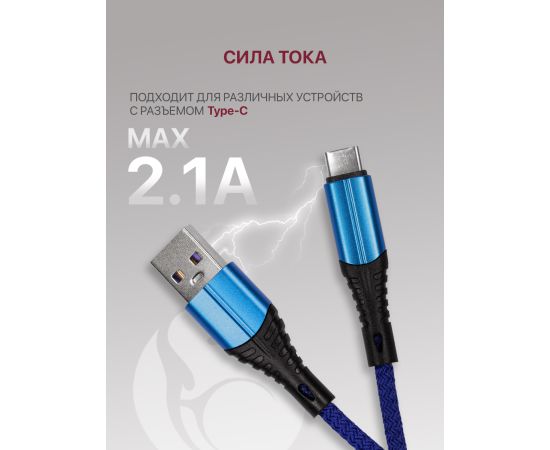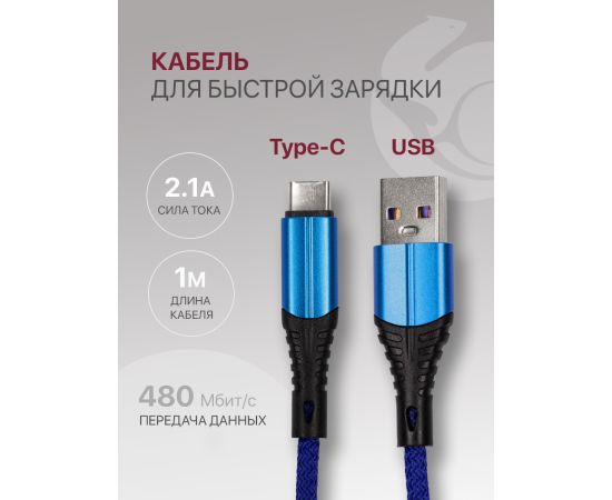 Кабель Type-C-USB для быстрой зарядки и передачи данных (2.1A) нейлоновый, синий (1м)