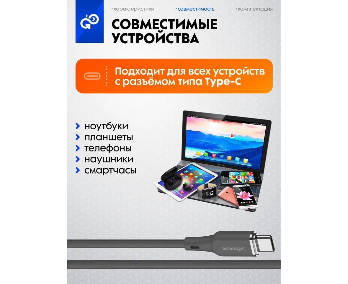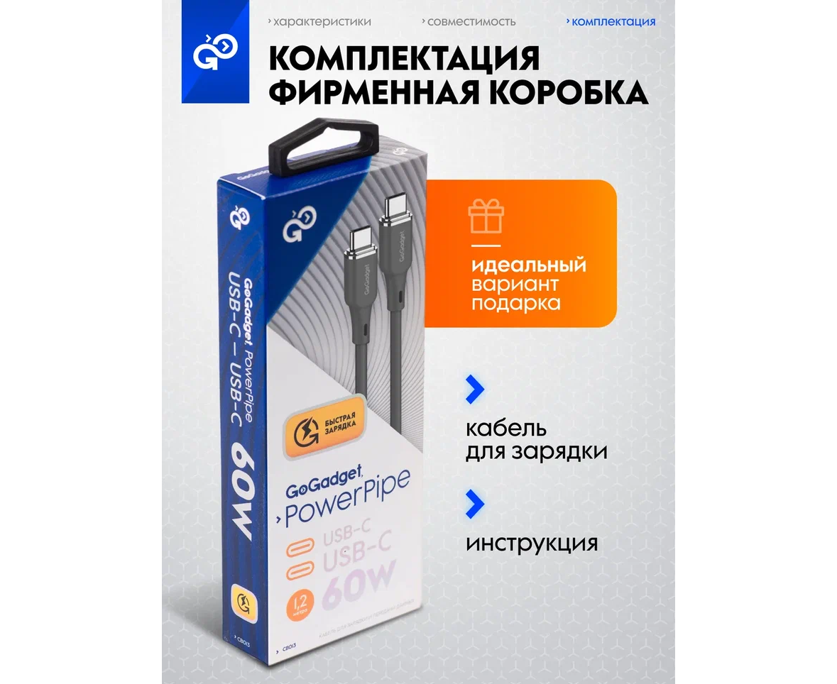Кабель GoGadget USB-C/USB-С, 60Вт, 1,2 м Силикон, Темно-серый