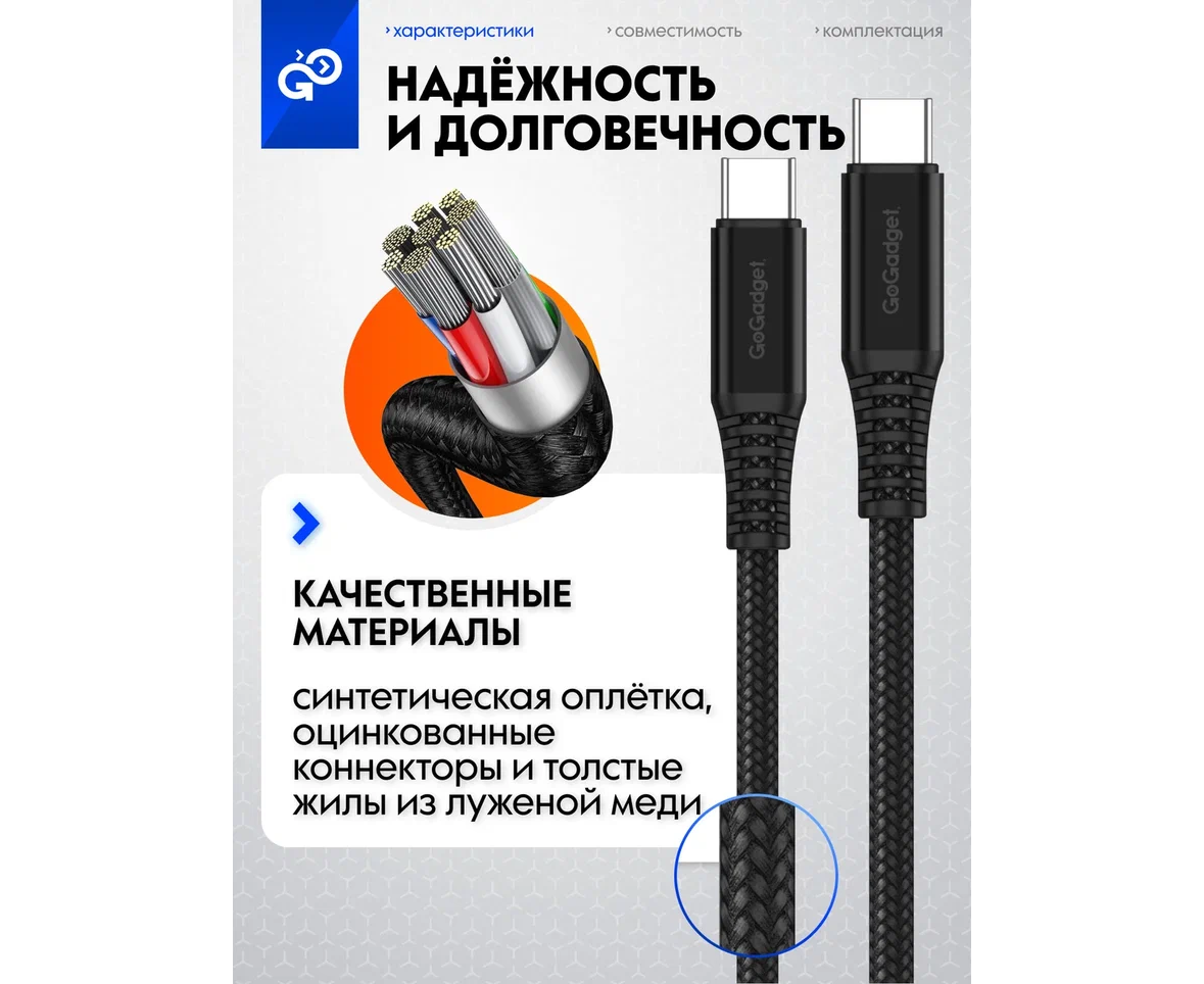 Кабель GoGadget USB-C/USB-С, до 60Вт, 3А, 1,2 м Нейлон, Черный