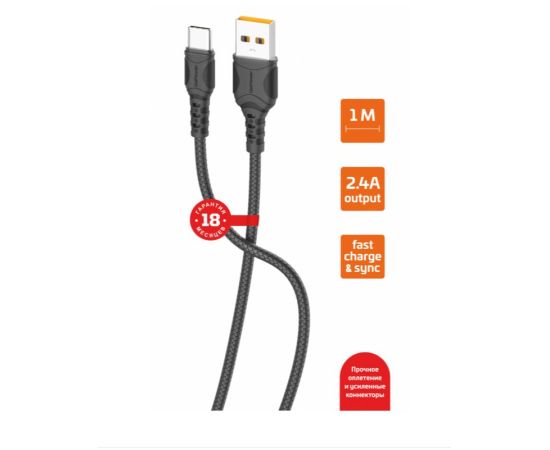 оплеткой из ПВХ и усиленными коннекторами. Пропускнаяспособность кабеля 2.4А обеспечивает поддержку быстрой зарядки (FAST CHARGE).