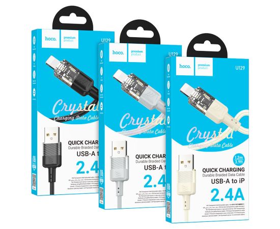 U129 Spirit, USB на iP зарядный дата кабель, ток до 2.4A, нейлоновая оплётка, длина – 1.2м
