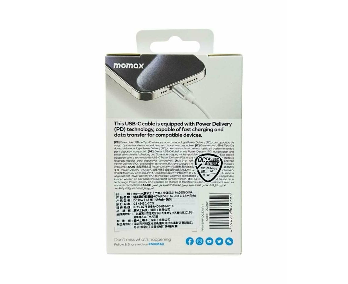 Кабель Momax Elite DC30W USB-C/USB-C 1.5м White
