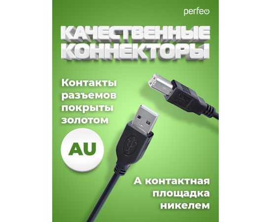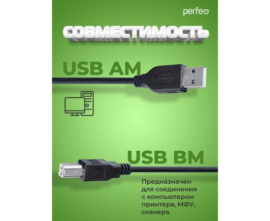 Кабель usb A(m) – B(m) для подключения периферийных устройств типа принтера, сканера, МФУ. Плотная и прочная оплетка из ПВХ, длина 1м, 1,8м, 3м или 5м надежное соединение благодаря позолоченным контанктам - это то, что Вы получаете при покупке кабеля от Perfeo. Провод выполнен из меди, литые разъемы. Шнур изготовлен с соблюдением всех стандартов качества. Подходит для Canon, HP, Epson, Lexmark, Oki, Ricoh, Pantum.