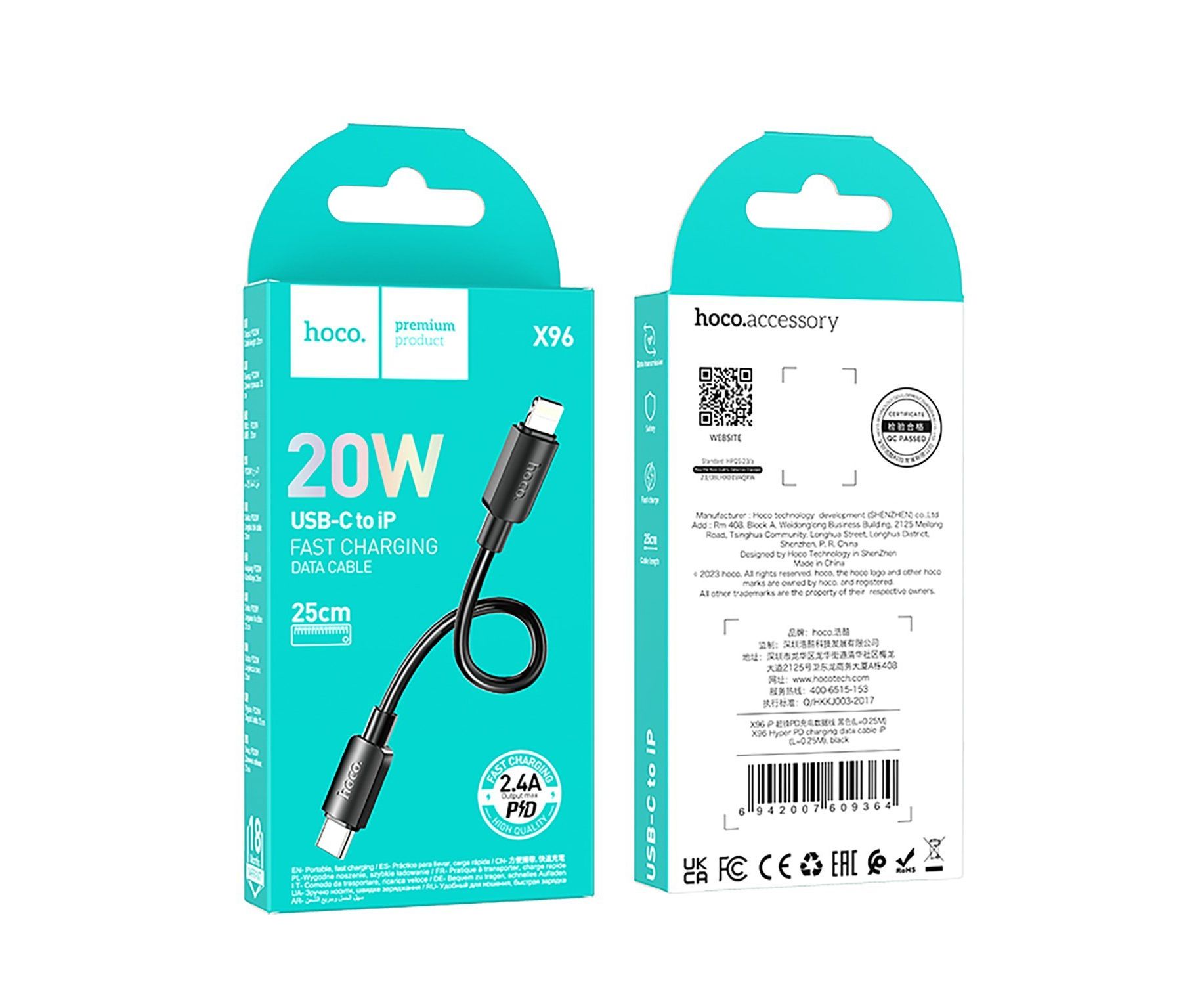 Кабель Type-C - Apple lightning Hoco X96 27W 25см 2,4A (black) (222404)