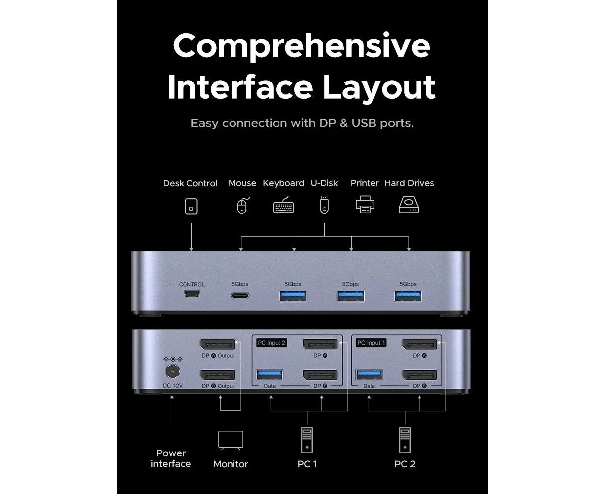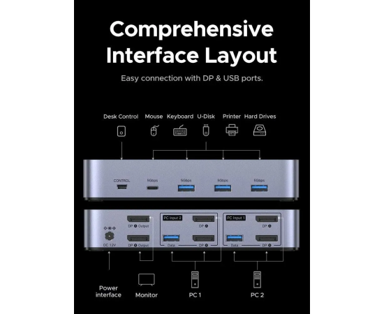 UGREEN AK700 (55851) — это высокопроизводительный KVM-переключатель, разработанный для эффективного управления двумя компьютерами с использованием двух мониторов DisplayPort и одного комплекта периферийных устройств.