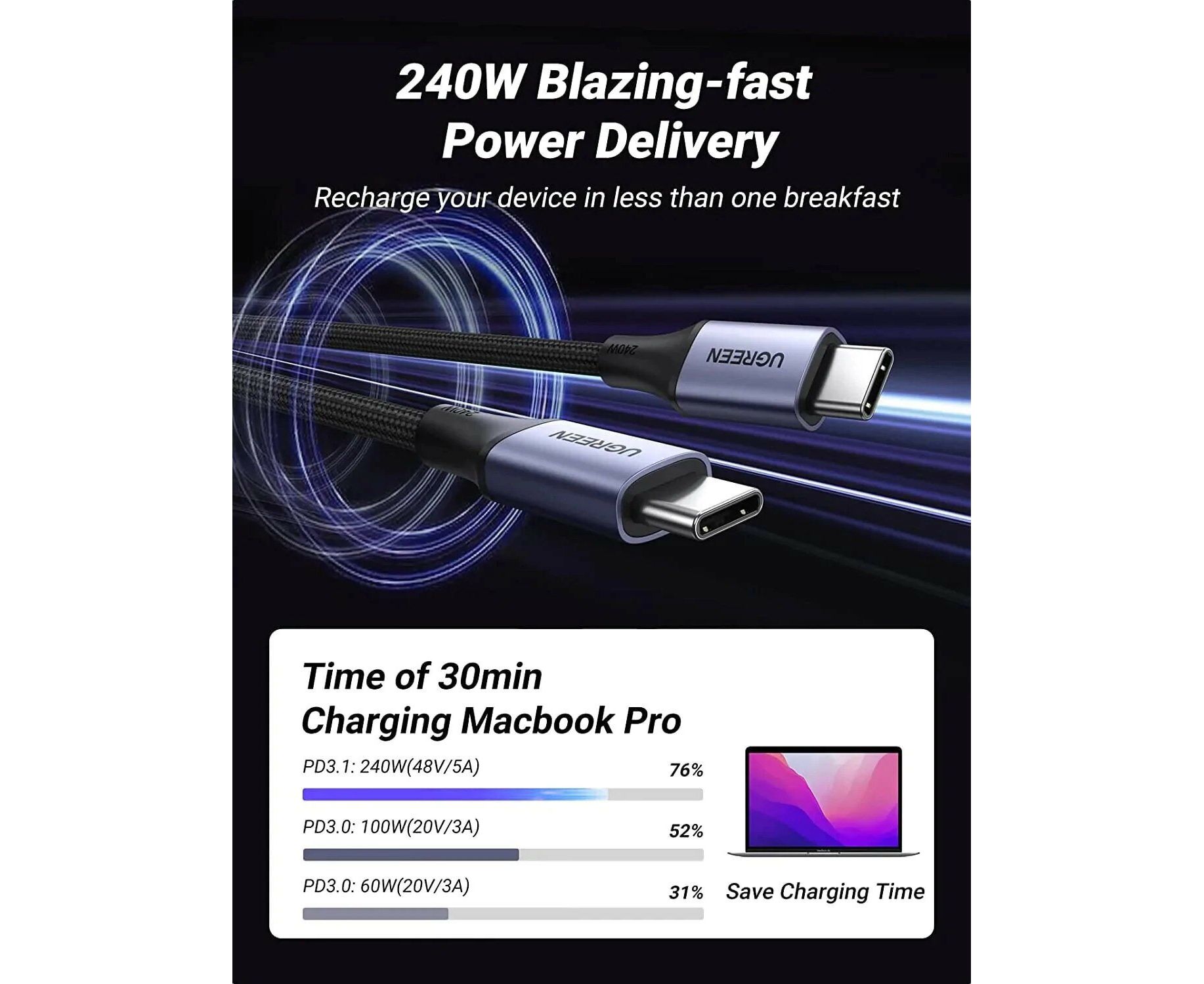 Кабель UGREEN US535 90440 USB-C to USB-C 240WPD Fast Charging Cable 2m Space Gray